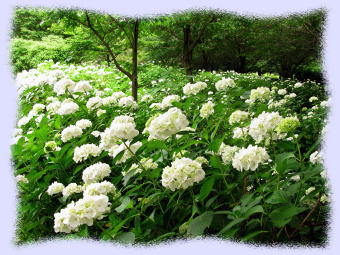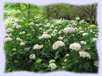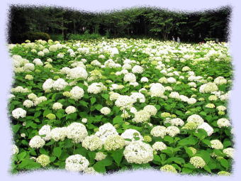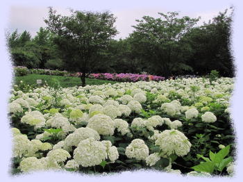 アジサイ園の一区画には白色のアメリカ産アジサイである「アナベル」が全面に密集して植栽されている部分があり、一区画が全面白一色になり、なかなか見事な状態になっています(右の写真です)。