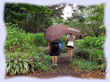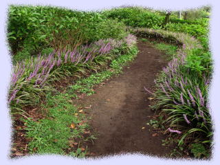 ヤブランの花は濃い鮮やかな紫色の小さい粒状の花が根元から伸びた花茎に沿って多数集まっている形状で、小道沿いに一斉に咲いている状態はなかなか見ごたえがあります。