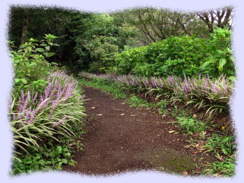 ヤブランの花は濃い鮮やかな紫色の小さい粒状の花で、小道沿いに一斉に咲いている状態はなかなか見ごたえがあります。