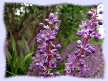 ヤブランの花は根元から伸びた花茎にたくさんの紫色の小さい花をつけ、小さい花が順番に開いていきます。